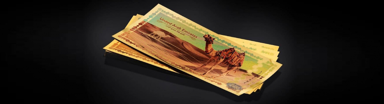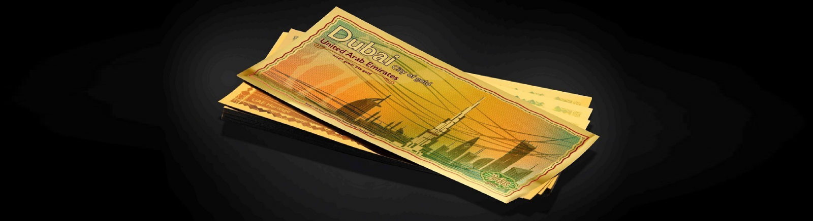 هر قطعه از این اسکناس دارای ۰.۱ گرم طلای ۲۴ عیار است. این اسکناس سوغاتی زیبایی خط افق دبی را به نمایش می گذارد و هر قطعه با شماره سریال منحصر به فرد متمایز می شود.