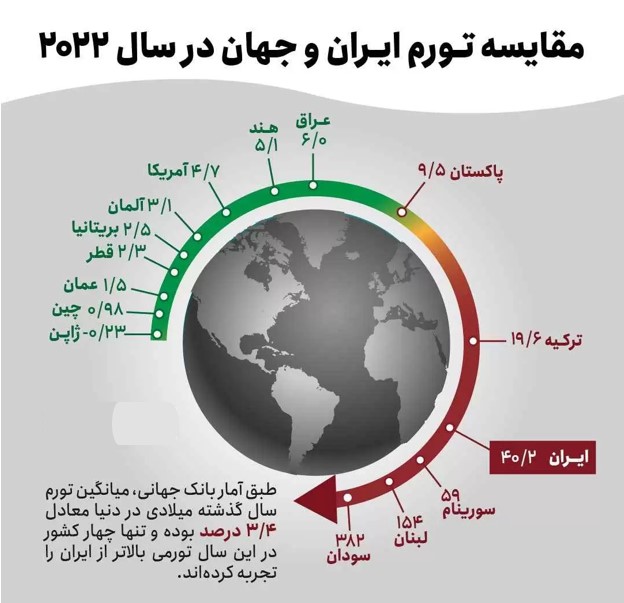 مطابق گزارش مرکز آمار، نرخ تورم ایران در سال ۱۴۰۰ به ۴۰.۲ درصد رسید. این در حالیست که طبق آمار بانک جهانی، میانگین تورم سال گذشته میلادی در دنیا معادل ۳.۴ درصد بوده و تنها چهار کشور در این سال تورمی بالاتر از ایران را تجربه کردهاند.