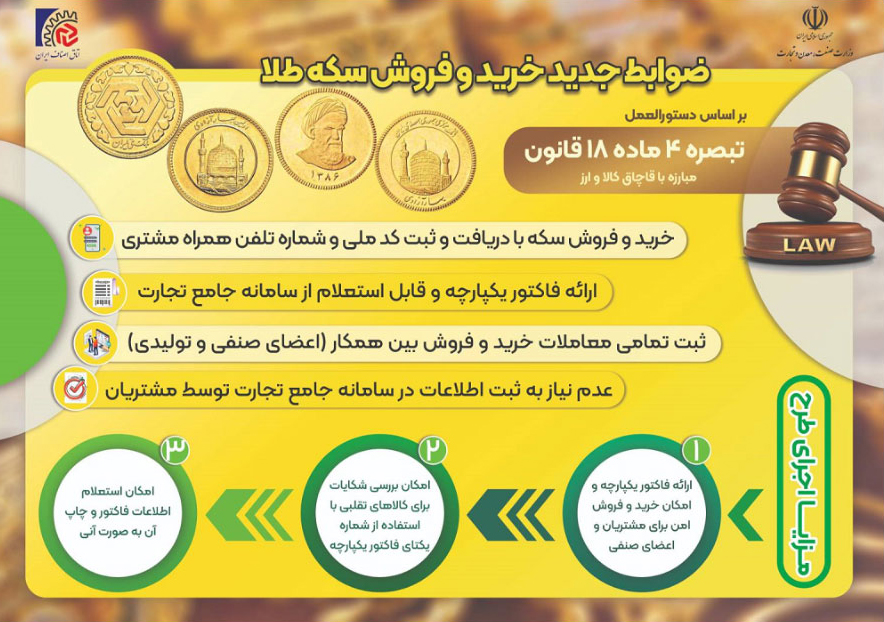 به موجب ابلاغ ضوابط اختصاصی گروه فلزات گرانبها و گوهرسنگ ها و الزام ثبت معاملات توسط اعضای صنفی مرتبط و اطلاع رسانی در این زمینه، معاونت صنایع عمومی دفتر صنایع خلاق و ورزشی وزارت صمت پوستر یکپارچه ضوابط جدید خرید و فروش سکه طلا را طراحی کرده است.